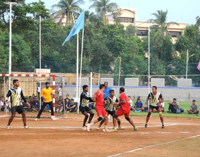 Handball (also known as team handball or Olympic handball) is a team sport in which two teams of seven players each (six outfield players and a goalkeeper) pass a ball using their hands with the aim of throwing it into the goal of the other team.